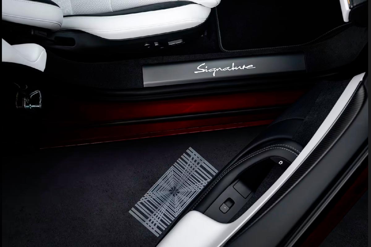 Cette édition spéciale se distingue immédiatement par sa présentation. Chaque véhicule adopte une teinte rouge grenat inédite, accompagnée de badges dorés à l’avant comme à l’arrière. L’intérieur poursuit cette logique avec une ambiance blanche en Alcantara, rehaussée de détails dorés, de surpiqûres spécifiques et d’une plaque numérotée sur la planche de bord.